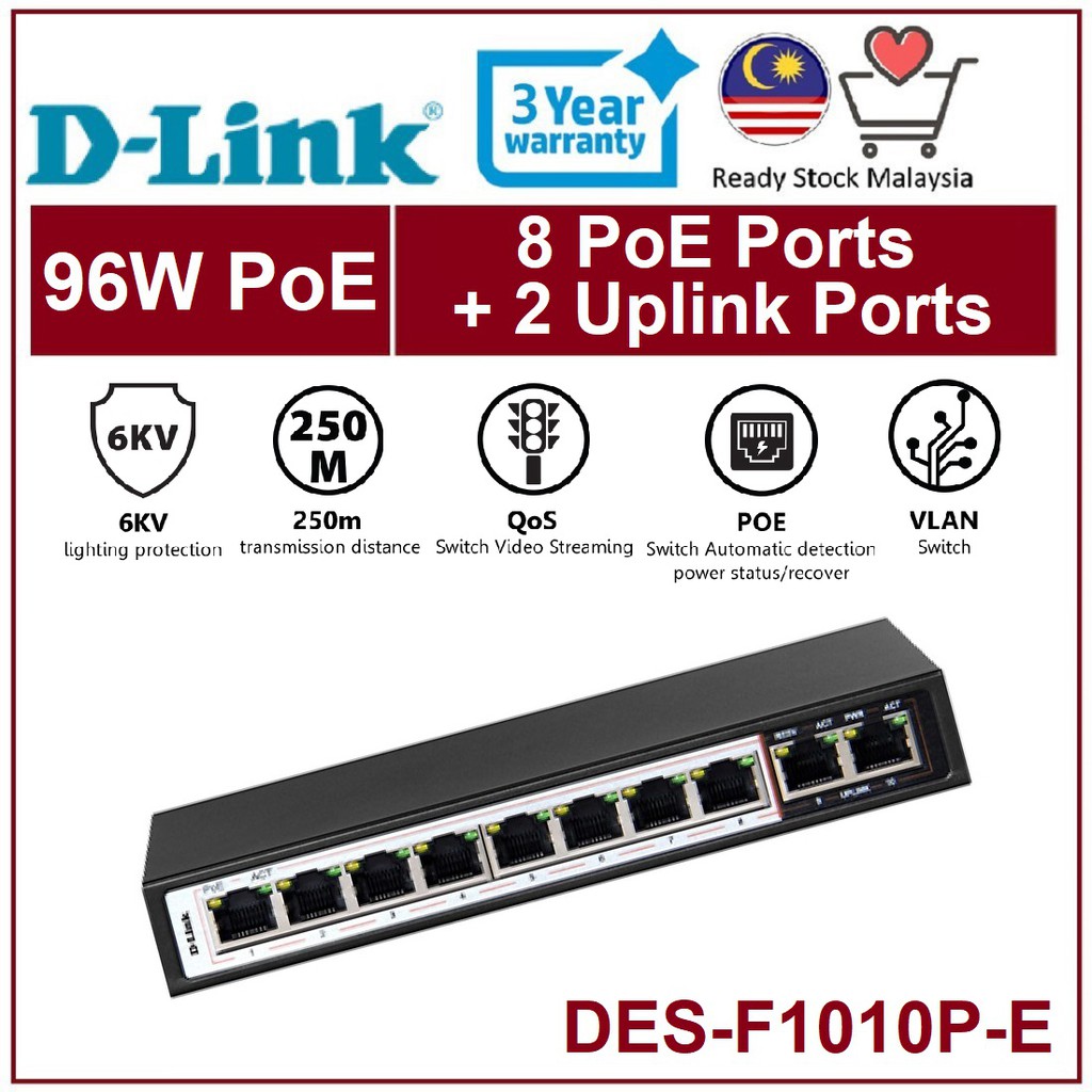 D-LINK DGS-F1010P-E 250M 10Port Switch with 8 POE Ports ... from cf.shopee.com.my Get contact details and address | id: Fast shipping and free tech support. 8+2 port | 2 gbps. 4 plug & play installation. Extend, vlan, qos and poe. This effectively protects the switch against sudden electrical surges caused by events such as lightning strikes or unstable electrical current.